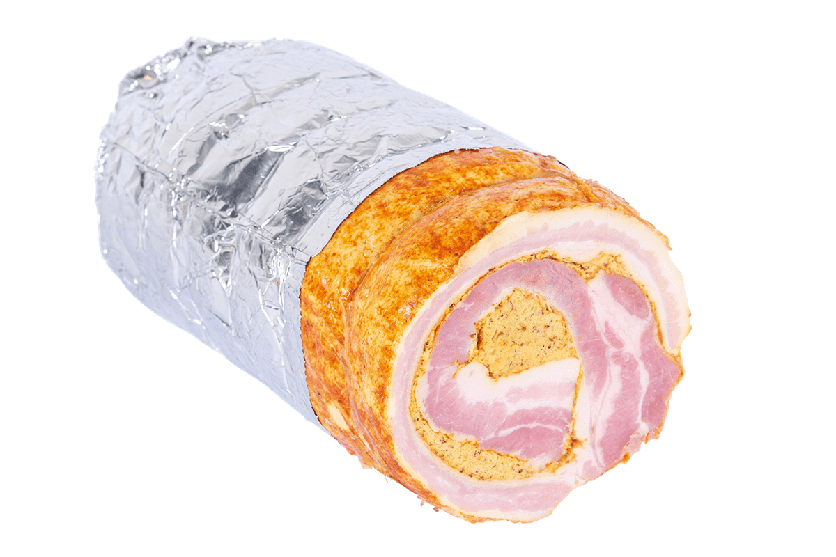Een gepekelde varkensbuik wordt ingewreven met kruiden en een laagje pittige Belgische mosterd.
