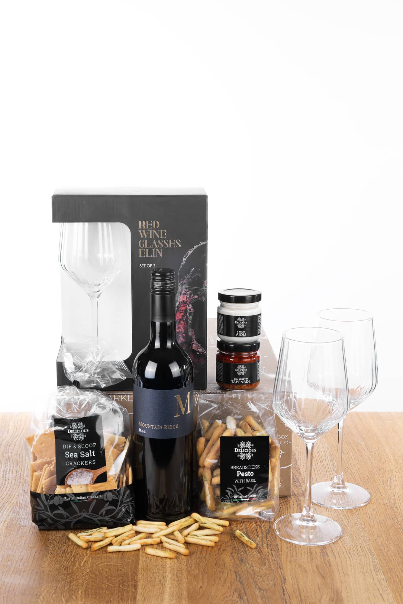 € 28,00 excl. BTW. Een smaakvol pakket vol heerlijke delicatessen en bijpassende rode wijnbeleving.